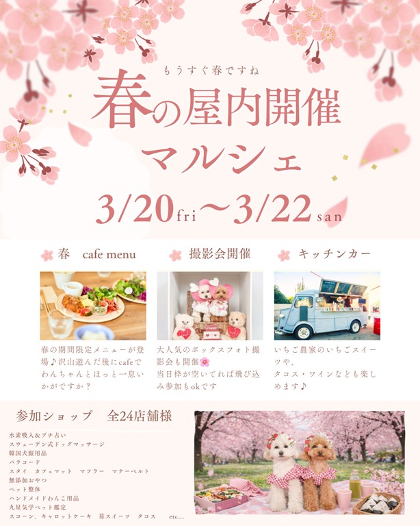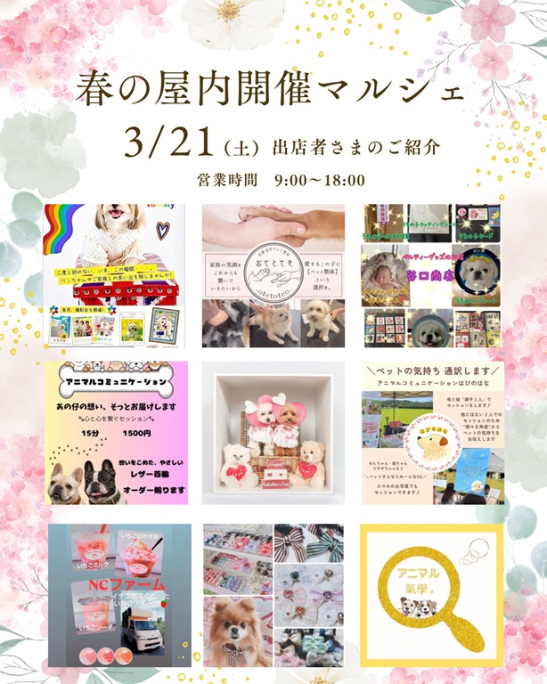3/17 3連休イベントのお知らせ♡ 3/20スマイルアップマルシェ、3/21お犬さまパーク春の屋内開催マルシェ、3/22こむこむ♡みんなのキラキラ★マルシェ