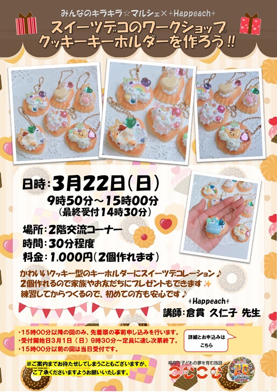 ・22日(日)→ ◆こむこむ♡みんなのキラキラ☆マルシェ◆/9:50~14:30/こむこむ館2F/スイーツデコのクッキーキーホルダーWS